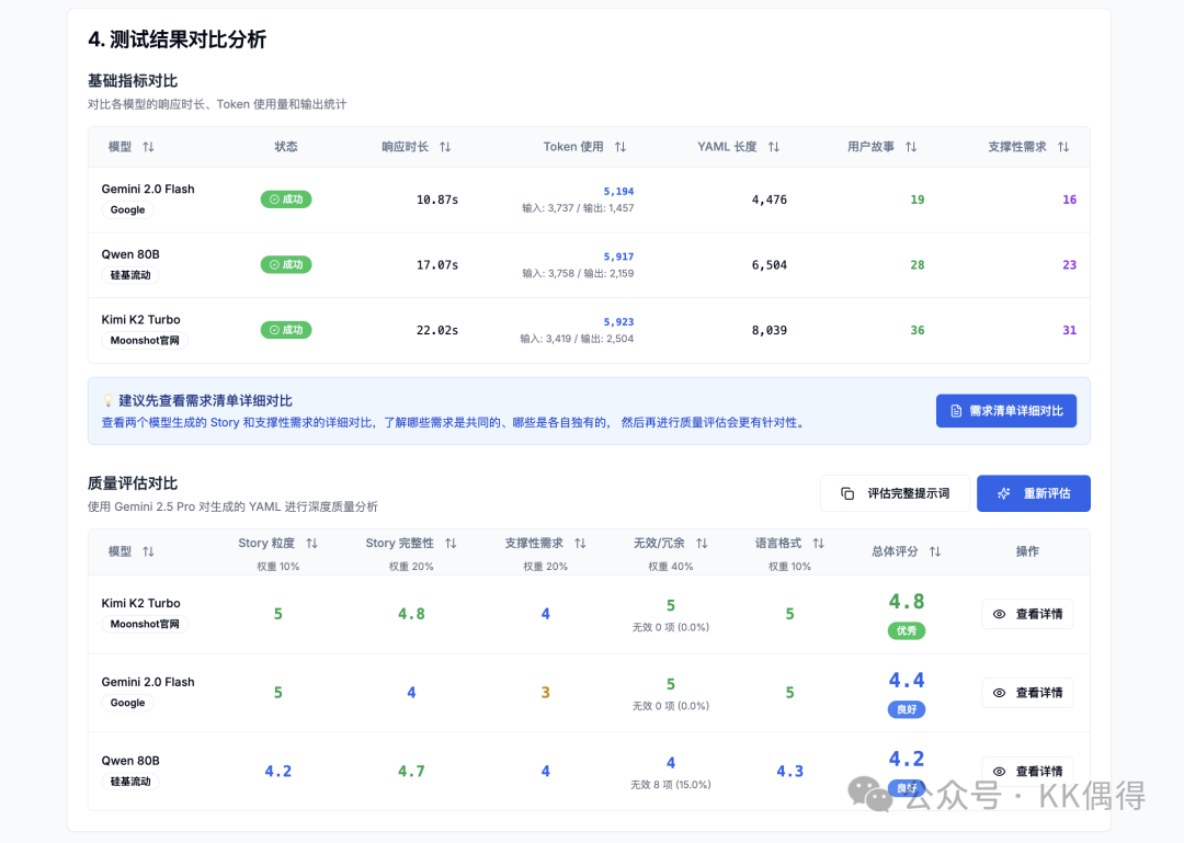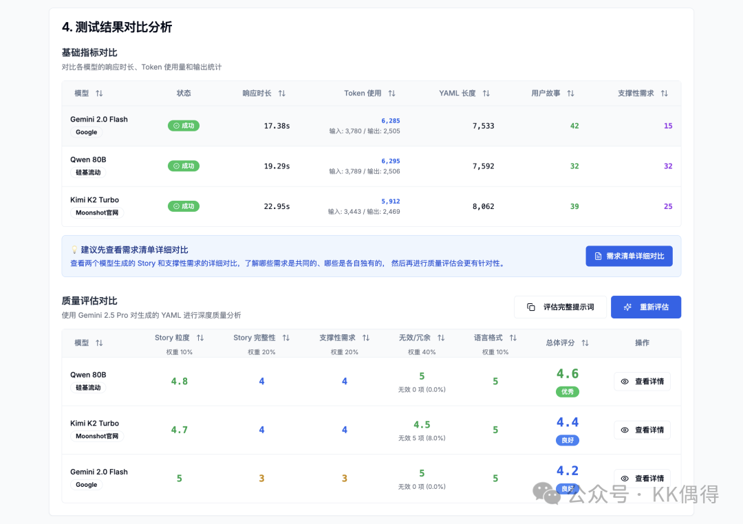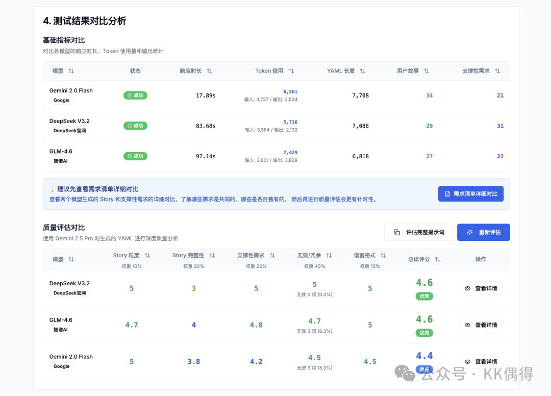 质量评估:使用 Gemini 2.5 Pro 作为评估模型,从需求覆盖度(30%)、结构完整性(20%)、描述质量(10%)、无效内容比例(40%)等维度进行智能评分。