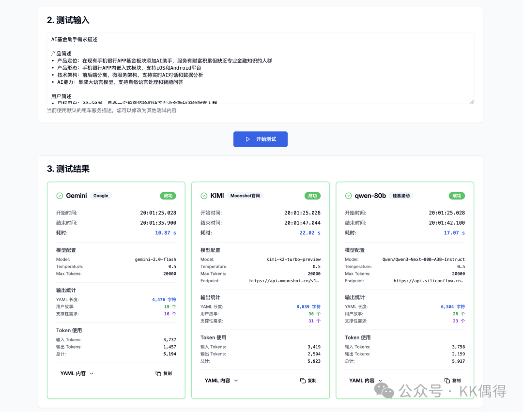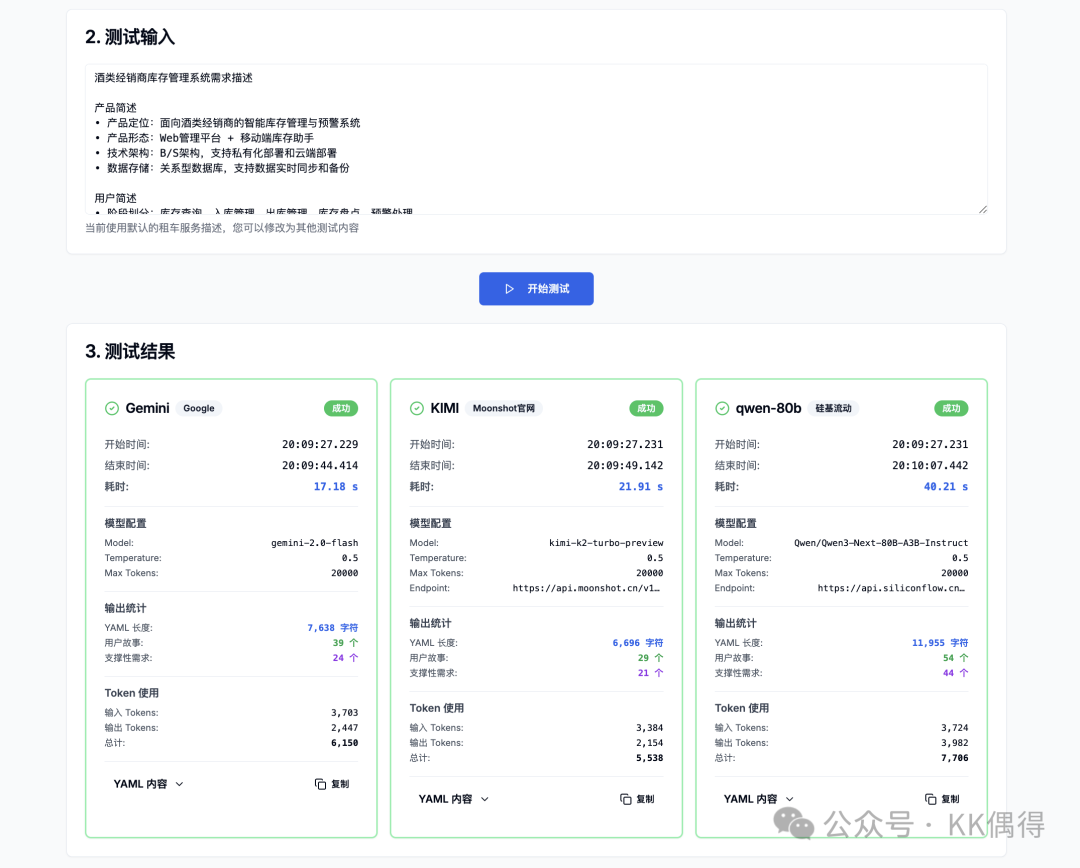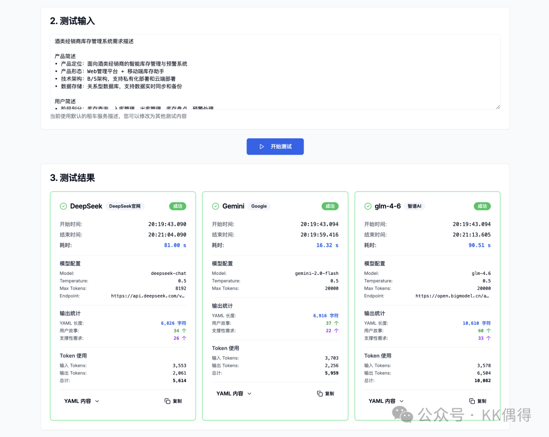 基础指标:响应时长、Token 使用量、输出统计(YAML 长度、用户故事数、支撑性需求数)